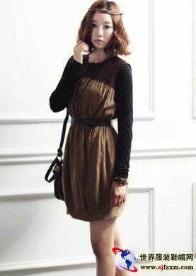 简单描述:运用不同色系的拼接,打创视觉美,折位和灯笼式的完美融合,呈现给人是即休闲又时尚的裙装,卡其与咖啡的完美衬托,非常高雅.配有黑色打底与腰带,整套非常时尚.