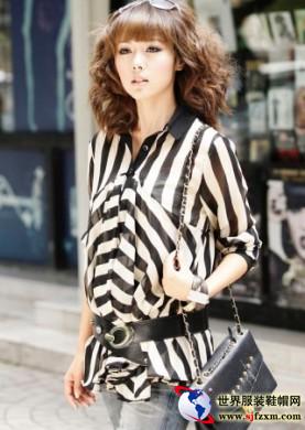简单描述:一直以来,“条纹”深受人们喜爱,从未没落。这款雪纺条纹更为有型哦。精致的剪裁,特别的几何条纹设计,打造潮流感十足的迷幻。宽松版型休闲随意,。配搭腰带修身又是一番好心情。薄而不透的雪纺丝质面料,透气、柔软舒适,触感自然、不变形,不抽纱。