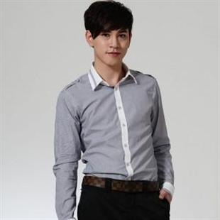 比朗 男士长袖拼领蓝白条纹衬衫休闲撞色衬衣