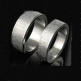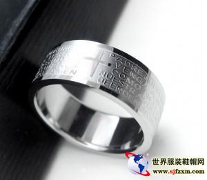 【商品简介】: 打磨:抛光面 戒指上电蚀英文字母,为圣经的一段落,激光雕刻文字(令到表面有不同的凹花纹图案或文字,效果细致,而且不会磨损),经文的大概意思是:“我们在天上的父,愿人都尊你的名为圣,愿你的国降临,愿你的旨意,行在地上,如同行在天上,我们日用的饮食,今日赐给我们,赦免我们的过失,如同我们原谅了别人对我们的冒犯,不叫我们遇见诱惑试探,救我们脱离邪恶,阿门”PUNK风格,街头型人、潮人装备,适合时尚超酷男/女,中性人士佩戴!